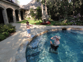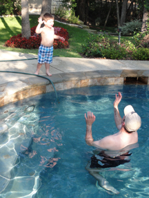 Sawyer and Brent play catch in the pool.