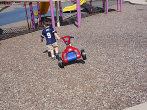 Finding it a bit tough to ride on the wood chips, Sawyer